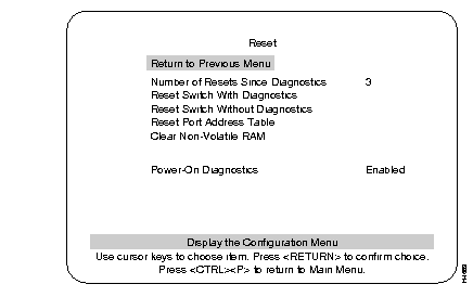 A reset function is initiated with this selection. It resets the switch hardware; runs diagnostic tests; clears all counters, including address tables; and restarts the Catalyst 3200. When the Catalyst 3200 reboots, administrative parameters from nonvolatile memory are used to initialize the operational parameters. This takes approximately 4 to 5 minutes.