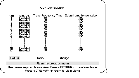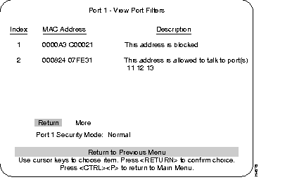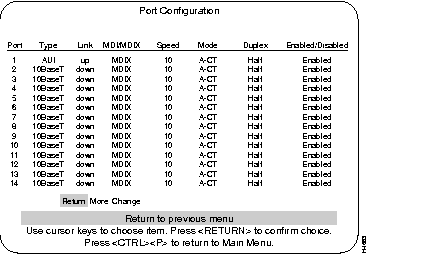 Step 2 From the Configuration main menu, choose Port Configuration. From this menu display, choose "More" to display information for ports 17 and 21. Verify that the status fields associated with it are similar to the example screen shown below (except for MDI/MDIX).