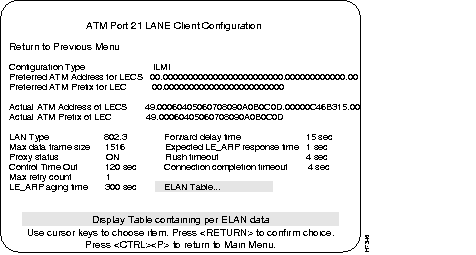 Step 4 From the Configuration menu, choose the "ATM Configuration" menu. From that menu, choose the "Lane Client Configuration" menu and enter the appropriate ATM port number. Verify the ATM address information in the ATM LANE Client Configuration menu that is displayed and then from that menu, select the ELAN Table sub-menu and verify information on configured ELANs.