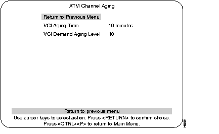 The ATM Channel Aging menu is used to age out less frequently used ATM channels. The concept of address aging and management is described in the Address Aging section. This menu is accessed from the Address Aging menu. At the Address Aging menu, select ATM Channel Aging and press RETURN.