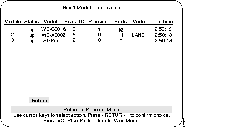 Step 1 From the Configuration menu, select the Module Information sub-menu and press RETURN. The Module Information screen is displayed. Verify that "WS-X3006A" is displayed and that the status fields associated with it are similar to the following example screen (except for revision level).