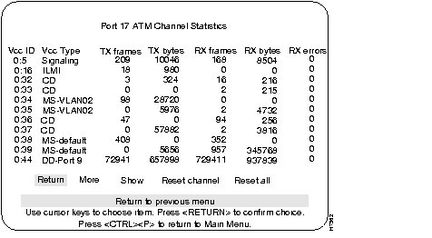 The ATM Port Channel Statistics menu lists the number of frames and bytes that were transmitted and received by the channels on the selected ATM port. The last column lists any receive errors.