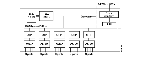The architecture of the Catalyst 3900 centers around the AXIS bus, a 520 Mbps switching fabric through which all switched ports communicate. The AXIS bus is a partially asynchronous time division multiplexed bus used for switching packets between heterogeneous LAN modules.
