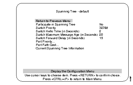 Select Yes or No by moving highlight to heading, pressing RETURN, move highlight to Yes or No and press RETURN. If you select No, the remaining values on the menu will be saved, but will have no effect. Selecting Yes will enable spanning tree upon exiting this screen.