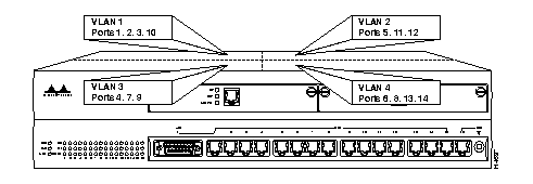 This section describes VLAN, the next selection on the Configuration menu. The optional VLAN feature is available on the Enhanced version of the Catalyst 3000 (contact your Cisco sales representative for information). Using the VLAN feature, you can partition a single Catalyst 3000 into a VLAN each containing its own set of ports. Packets are forwarded only between ports belonging to the same VLAN. The benefit of VLAN is to restrict access from one segment to another, either for security purposes or to reduce intersegment traffic. Figure 7-1 illustrates a Catalyst with four VLANs.