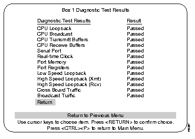 The Diagnostic Test Results screen is a list showing whether errors or a specific diagnostic test has failed at a specified Box (Catalyst 3000). This display is selected by highlighting the Diagnostic Test Result heading at the main Statistics menu and pressing RETURN. At the prompt, enter the box number you want to view.