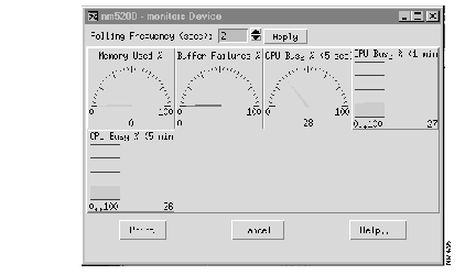 CiscoView displays performance information through the Monitor menu on the main window or by selecting Monitor from a component popup menu. Performance information is displayed in a dashboard made up of a collection of small graphical displays in one window. For more information on the dashboard monitor, see "Using the Dashboard Monitor" section.