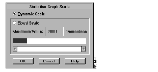 The Set Statistics Graph Scale dialog box, shown in Figure 2-14, sets the vertical scale for the Ethernet Statistics window in frames/sec. The default is Dynamic Scale, which sets the scale automatically depending on the magnitude of the data. If you choose Fixed Scale, you can set the maximum value in the scale yourself using the horizontal scroll bar.