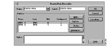 | Interfaces... | Displays the Interfaces dialog box. From the entities box, select an entity, then click Interfaces. The Router/Hub Interfaces dialog box appears, as shown in Figure 3-25 and described in Table 3-35. |