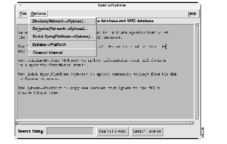 Run Sync w/Sybase if you just initialized your NMS and want to fully synchronize both databases. Run Sync w/Sybase from the device menu if you want to synchronize one or more specific devices. In both cases, the Sync w/Sybase window, from which you can select other options, appears.