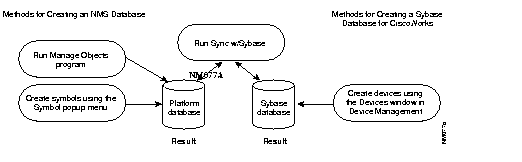 Figure 4-5 illustrates the relationship between the SunNet Manager and CiscoWorks databases. Although you can add device names directly to either database, you must run Sync w/Sybase to confirm that the information about a particular device is correct in both places.