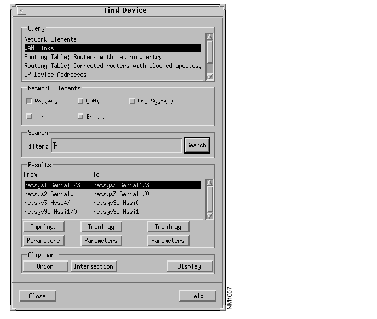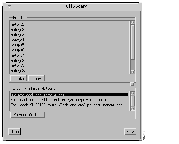 The Clipboard window, shown in Figure 3-10, allows you to save and merge the results of various queries performed in the Find Device window and to perform the batch processing actions listed in the Batch Analysis Actions list when using the Connectivity Solver. See Chapter 6 in the Enterprise/Solver Connectivity Tools User's Guide for a tutorial describing the use of the batch analysis capabilities. You display the Clipboard window by clicking on the Display button in the Find Device window or by selecting the Options>Show Clipboard menu option in the Connectivity Tools window.