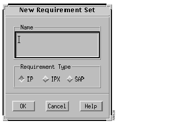 The New Requirement Set window, shown in Figure 7-2, is displayed when the New button is clicked in the Requirement Sets window. Specifying a name and requirement type (IP, IPX, or SAP) generates an empty requirement file set. Requirements are then added to it using the Add IP/IPX/SAP Requirements window, displayed when the OK button is clicked. The newly created requirement file set is added to the Requirement Files list in the Requirement Sets window.