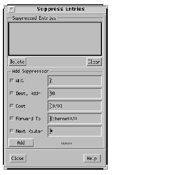 This window's components are described in the following sections. See "General Window Components" for a description of the Close and Help buttons. When you click on the Close button, the suppression parameters currently in effect are saved. When you subsequently invoke the IPX Suppress Entries window, the suppression parameters that were in effect when the window was last closed remain in effect.
