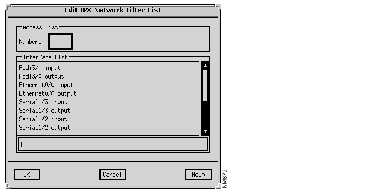 The Edit IPX Network Filter List window, shown in Figure 10-13, is displayed when you click on the Add button in the Network Filter Interface List pane in the RIP IPX Algorithm window. This window allows you to specify the interface, network filter direction, and IPX access list number to apply to this network filter. Network input filters are used to control which networks are added to the router's Routing Table. Network output filters are used to control the list of networks included in routing updates sent out an interface.