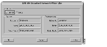 The Edit IPX Standard Network Filter List window, shown in Figure 10-15, is displayed when you click on the Add Before, Add After, or Edit buttons in the IPX Standard Network Filter List window. This window allows you to define an IPX network filter extended access list entry and add it to the selected access list.