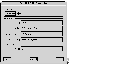The Edit IPX SAP Filter List window, shown in Figure 10-12, is displayed when you click on the Add Before, Add After, or Edit buttons in the IPX SAP Filter List window. This window allows you to create a SAP filter which is then added to the IPX SAP Filter List in the IPX Routing Algorithms window.