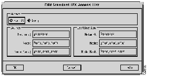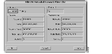 The Edit IPX Extended Network Filter List window, shown in Figure 10-17, is displayed when you click on the Add Before, Add After, or Edit buttons in the IPX Extended Network Filter List window. This window allows you to add or modify an extended IPX network filter access list entry. The window's components are described in the following sections. See "General Window Components" for a description of the OK, Cancel, and Help buttons.