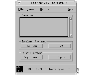 The Connectivity Tools window is again displayed. The File>Open Baseline, File>New Baseline, File>Delete Baseline, and File>Exit menu options are the only activated window components as the newly created baseline (tutorial_baseline)has not been loaded into memory at this time. To load a baseline into memory thus creating the baseline model, use the File>Open Baseline option.