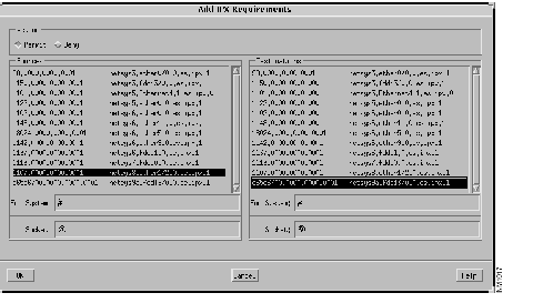 The Add IPX Requirements window, partially shown in Figure 10-5, is displayed. You create new requirements in the ipx_test requirements set using this window. Allow (Permit button selected) an IPX connection from socket 20 of source end system netsys8.ether1/2.0.es.ipx.1 (1107.0000.0000.0001) to socket 30 of destination end system netsys9a.fddi3/0.0.es.ipx.1 (c65c6700.0000.0000.0001).