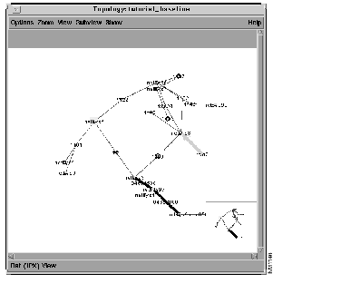 Assess the status of the results in the tutorial_baseline+ Requirements Analysis window then check the Topology (Figure 10-18) and Round Trip Path windows to see the new, highlighted route taken. Notice the thicker path (source end system to destination end system) has changed its course (it bypasses the netsys3 router's fddi3/0 input interface.)