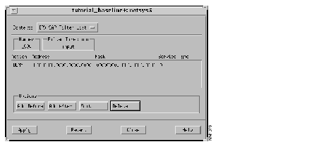 A requirement file set can also be loaded by double-clicking on an entry in the Requirement Files list. The ipx_test file set is now ready to have connectivity requirements analysis performed. The results of the analysis are viewed from the tutorial_baseline Requirements Analysis window, partially shown in Figure 10-8. That is, the status of each connectivity requirement entry loaded for analysis is shown. One existing path was found allowing the connection between the two end systems (netsys8.ether1/2.0.es.ipx.1 and netsys9a.fddi3/0.0.es.ipx.1).