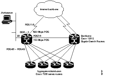 In a typical Internet service provider environment, the Cisco 12000 series routers reside within the core of the network and can support as many as 44 OC-3/STM-1 IP over SONET/SDH optical links to Cisco 7500 series routers or aggregation devices. Below is a typical configuration file for the Cisco 12012. Important configuration commands are bolded. In this example, a Cisco 12000 series router called GSR-A connects to the Internet backbone through interface POS11/0, connects to a second Cisco 12000 series router through interface POS7/0, and connects to Cisco 7500 series routers through interfaces POS4/0, POS4/1, POS4/2, and POS4/3. In addition, GSR-A also has a connection to a workstation through interface E0 for TFTP functions only (no routing is performed).