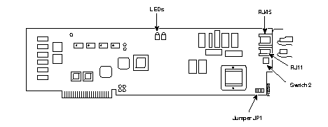 Two LEDs are located on the upper edge of the board. These LEDs have different meanings depending on the telephony interface configured under software control. When the card is configured for E&M operation, the red LED indicates the presence of the "M" lead when it is ON. The green LED indicates the presence of the "E" lead when it is ON. If the card is configured for FXS or FXO operating mode, the red LED (ON) indicates an off-hook condition at the local FastPAD. When the green LED is ON, it indicates a connection is established.
