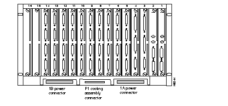 A backplane runs across the card cage spanning all 16 slots. The backplane is positioned approximately 14" from the front of the cage allowing a function module card to be inserted in the slot from the front and a smaller line module card to be inserted in the slot from the rear.