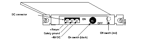 Each power entry module contains its own circuit breaker which also acts as an ON/OFF switch. The circuit breaker is closed by pressing in the large black button until it latches in the closed position. The circuit breaker is opened by pressing the smaller red button. The DC PEM also includes a bracket which is attached to the PEM to provide cable strain relief, see Chapter 6, "Installation and Start-up" for details.