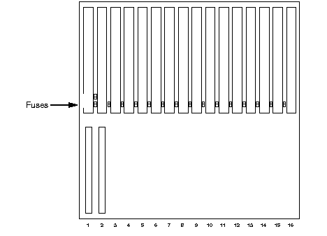 In the IGX 8, backplane fuses exist only on the back of the backplane. In an IGX 16/32, the location of the fuse depends on the version of the backplane. In older IGX 16/32 backplanes, the fuses reside on the front. Figure 5-8 shows the location of each fuse in an IGX 8 backplane. The fuse numbers are F1-F8. Two spare fuses are also present. Figure 5-9 and Figure 5-10 show current and early backplane fuse locations in the IGX 16 backplane.