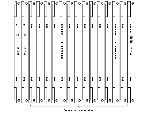 The IGX 8 backplane has eight 216-pin connectors. Each IGX 16/32 backplane has sixteen 216-pin connectors and occupies just over half the height of the card cage. The backplane is in the upper part of the card cage and connects up to 16 front cards. Figure 2-24 shows a front view of an IGX 16 backplane. Except for having 8 fewer card slots, the IGX 8 card cage looks the same as the IGX 16 backplane. The utility bus resides beneath the NPM slots at the left. The figure also shows the card guides in the front and rear. Each front card plugs into the backplane at the upper connector (P1). In addition to providing the physical connections between the cards, the backplane contains the system bus. The backplane is also called the midplane.
