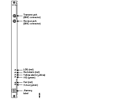 The AIT -T3 back card has two BNC connectors and six LED indicators, as Figure 3-9 shows. Table 3-12 lists these faceplate items. When you correlate the items in the figure and table, read from the top.