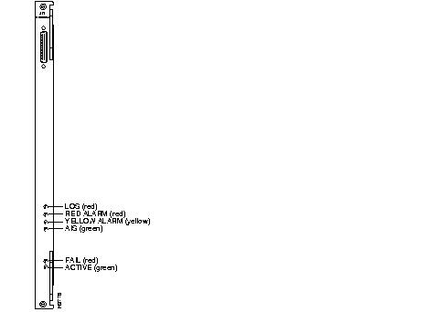 The faceplate of the ALM/B has four LEDs. See Figure 3-13 .The ACTIVE LED indicates the card is active and functioning. An ALM/B card failure triggers the FAIL LED. The other two LEDs are a summary alarm for the back card conditions. A yellow MINOR LED indicates either a fault that does not interrupt service or that error statistics have exceeded a preset threshold. A red MAJOR LED indicates a service-affecting failure.
