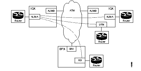 The ATM Line Module A (ALM/A) provides an ATM UNI port that allows devices such as routers or ATM switches to support VPCs and VCCs across the IGX. The ALM/A operates as a cell relay interface that supports basic connectivity to IGX interfaces or BPX ASI interfaces through a Cisco Stratacom network. The ALM/A supports ATM connections that terminate at either ATM or frame relay endpoints. With the processing that the IGX provides, cells can cross either an ATM trunk or a FastPacket trunk. This ALM/A description covers the following topics: