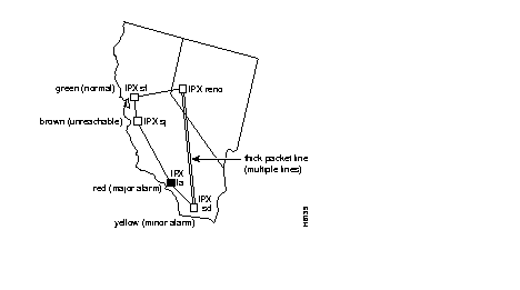 When the topology display is updated, the node and trunk icons change colors to reflect the latest alarm events.