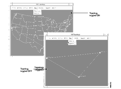 The following sections provide information on working with the topology display pulldown menu functions. The descriptions that follow are presented in order as you look at the pulldown menus from left to right in the Network Topology window.