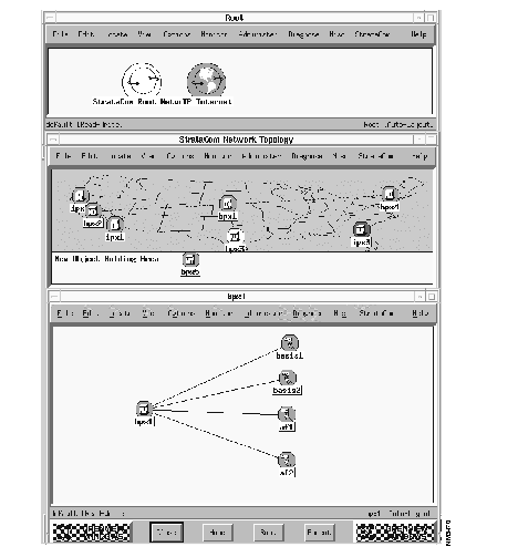 The tiered network design incorporates a BPX shelf submap. The following screens show three submaps, including the root level, the routing backbone level, and the shelf level. Included on the BPX shelf submap are icons for the BPX core shelf, BIS (IPX/AF) and AXIS. By default, a bus layout is incorporated into the display. Both the routing backbone submap and multiple shelf submaps (corresponding to each BPX) are created and maintained by StrataView Plus topology based on data originally from topology.