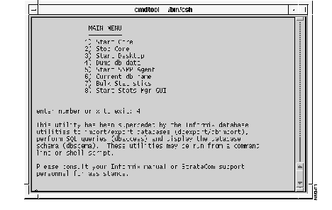 If you choose Item 4, "Dump db data" in the StrataView Plus Main Menu screen, you will be prompted to use the dbexport command.