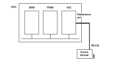 The maintenance port is the upper RS-232 connector on the ASC line module. The connector is DB-25 (female). With serial line access via the maintenance port, the user interface prompt appears once the dumb terminal is connected and the system is powered up. No special software is required and the connection is made through a standard (not null modem) cable. This arrangement is shown in Figure 3-1. Entering commands via a dumb (or emulated) terminal is the only use for the maintenance port. The maintenance port is configured for 8 data bits, no parity, one stop bit and 9600 bps.