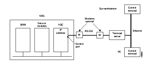 The control port is the middle RS-232 connector on the ASC line module. The connector is an RS-232 DB-25 (female). For this type of connectivity, the control terminal (PC or workstation) must support TCP/IP using a SLIP serial connection and the control port must have been previously configured with an IP address. The control terminal can be connected either locally or remotely using modems. When entering command line commands through the control port, the user interface prompt appears when the user performs a Telnet login to the port's IP address.