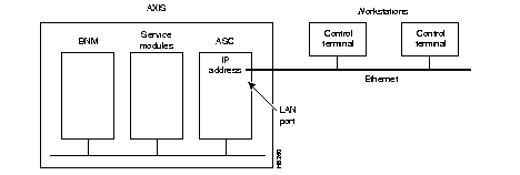 The LAN port allows the shelf to be connected to an Ethernet network using an appropriate transceiver. Thus a workstation connected to the Ethernet network can communicate directly with the AXIS. The port should be given an IP address to allow TCP/IP protocols to be used.