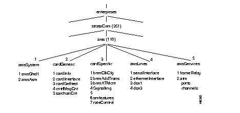 The AXIS MIB resides with an object ID of axis under the strataCom branch of the SNMP tree structure (1.3.6.1.4.1.351.110) as shown in Figure 3-6. The AXIS MIB consists of five major sections: axisSystem, cardGeneric, cardSpecific, axisLines, and axisServices.