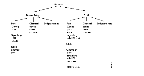 The axisServices sections consists of the AXIS service. This section contains information about frame relay channel configurations, configurable parameters, and LMI signalling. This section also contains similar MIB objects for ATM services.