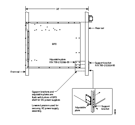 Figure 4-2 shows the location of the rear located third rails in a customer supplied cabinet and of the corresponding adjustable plates and support brackets on the BPX shelf.