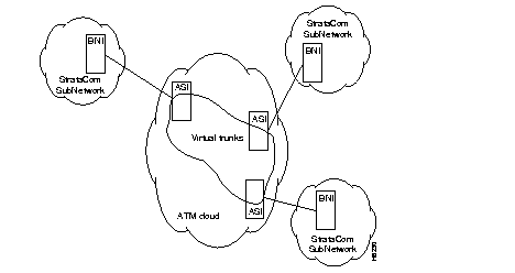 This section details the steps for setting up a virtual trunk. Virtual trunking is an optional feature that must be enabled by StrataCom prior to adding virtual trunks. Also, revision levels of ASI and BNI firmware must be current. The following procedure assumes that StrataCom equipment is used in the ATM Cloud as well as in the StrataCom subnetworks. In this case, a BNI output from the subnetwork is connected to an ASI UNI input at the ATM Cloud (Figure 5-1). Proceed as follows: