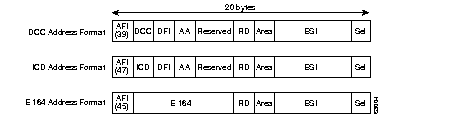 Figure 2-2 shows the format of private ATM addresses. The three formats are Data Country Code (DCC), International Code Designator (ICD), and Network Service Access Point (NSAP) encapsulated E.164 addresses.