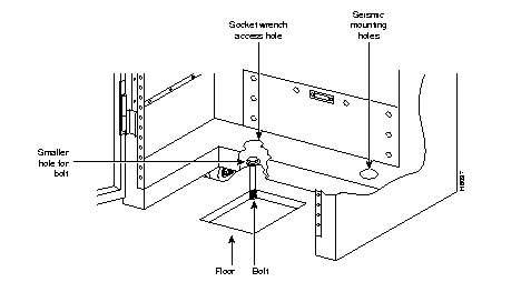 To provide protection against seismic activity, the IPX 16/32 cabinet is equipped with holes that permit the cabinet to be bolted to a concrete floor or to a structural member in the floor. The cabinet base has four sets of holes (two sets at the lower front and two sets at the lower rear). Each set consists of a large socket access hole above a smaller hole. The lower, smaller hole accepts the bolt that is attached to the floor. The upper, larger hole provides access for a socket wrench to tighten the bolt (see Figure 2-1 and Figure 2-2).
