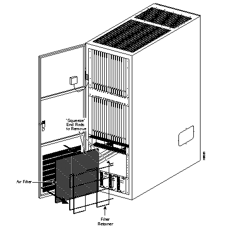 Every two months or more often depending on the environment, inspect the air filter assembly for dust buildup.The air filter sits below the card cage in the IPX 8 cabinet, at the front (Figure 3-2).