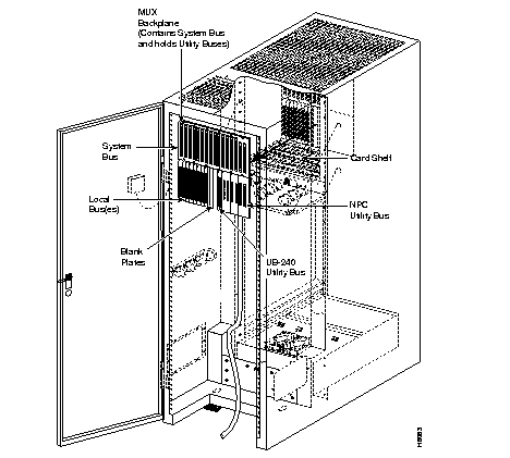 The MUXBUS backplane runs the full length of a card shelf and provides connections between the front and rear cards.